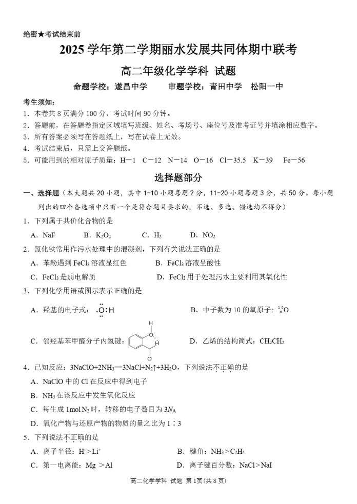 高二化学+答案--浙江省丽水市丽水发展共同体2025-2026学年高二下学期4月期中地理试题