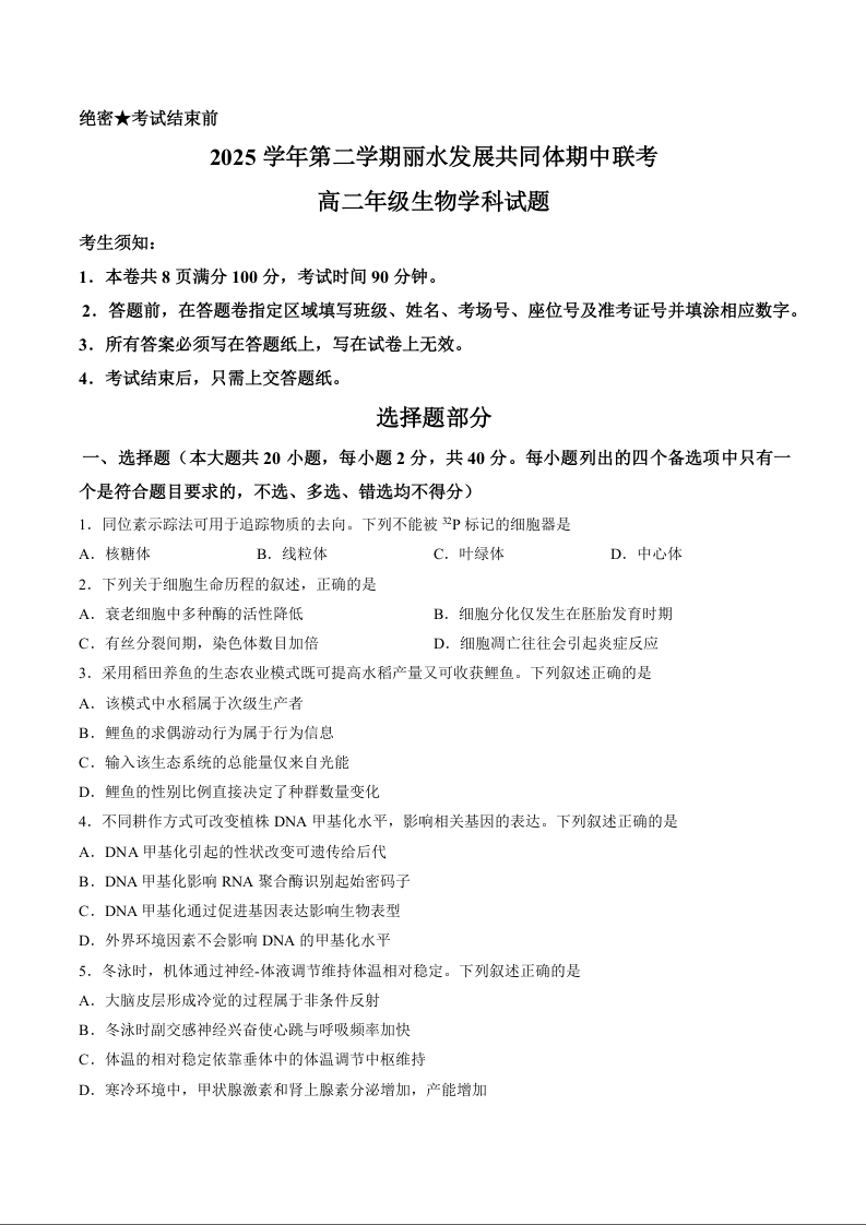 高二生物--浙江省丽水市丽水发展共同体2025-2026学年高二下学期4月期中地理试题