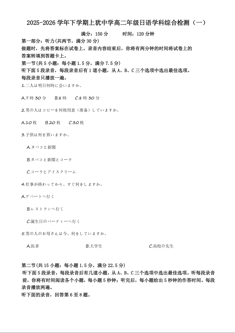 高二日语(解析版)--江西省赣州市四校2025-2026学年高二下学期综合检测联考(一)