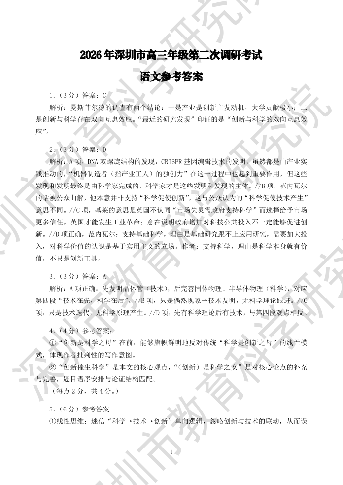 高三语文答案--广东省深圳市2026届高三下学期第二次调研考试