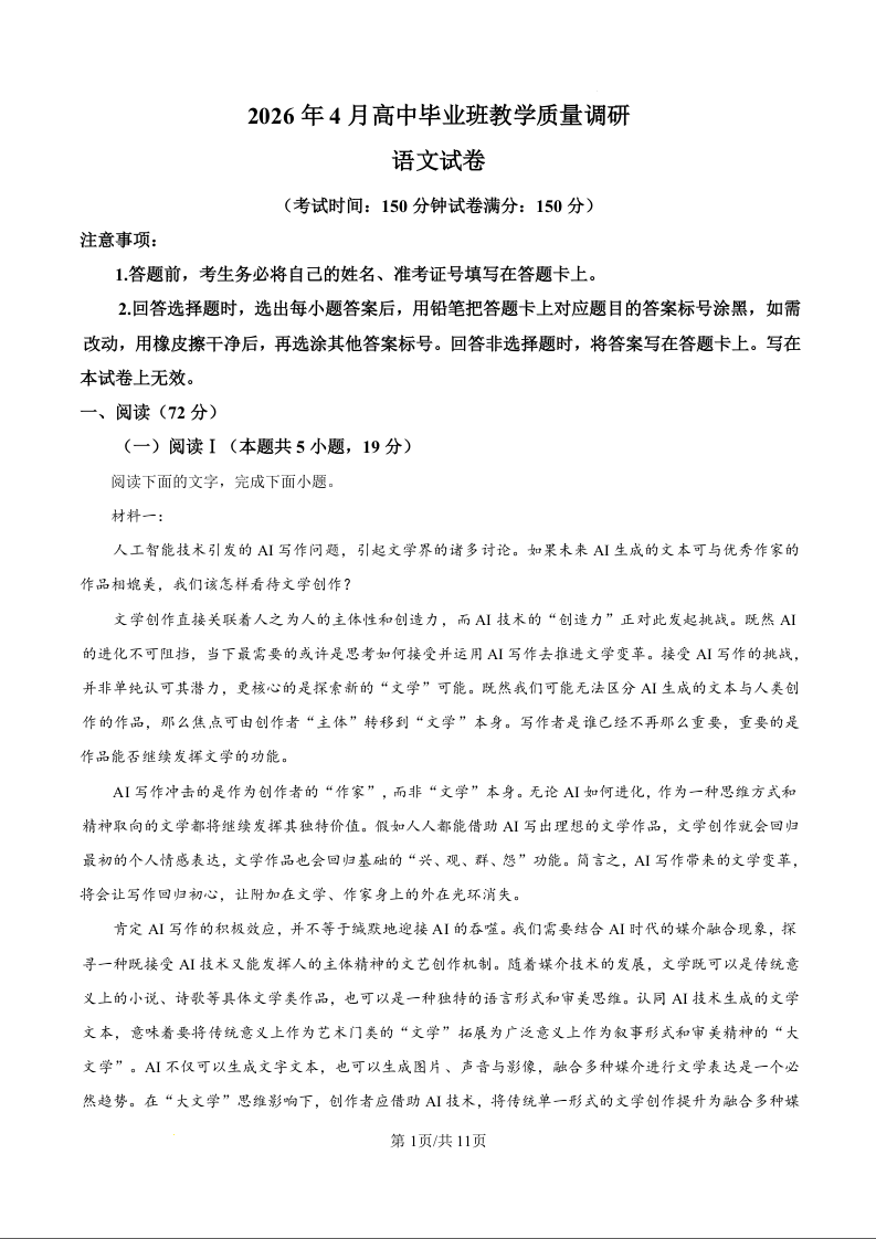 高三语文(原卷版)--广西南宁市2026届高三4月高中毕业班教学质量调研