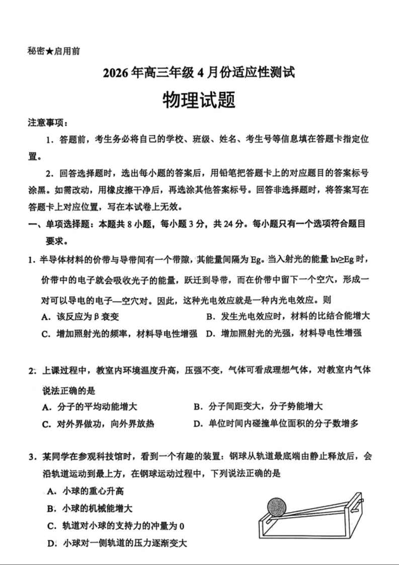 高三物理--山东省东营市2026届高三4月适应性测试(东营二模)