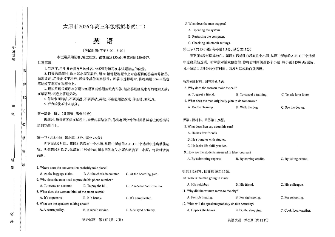 高三英语--山西省太原市2026届高三模拟考试(二)(太原二模)