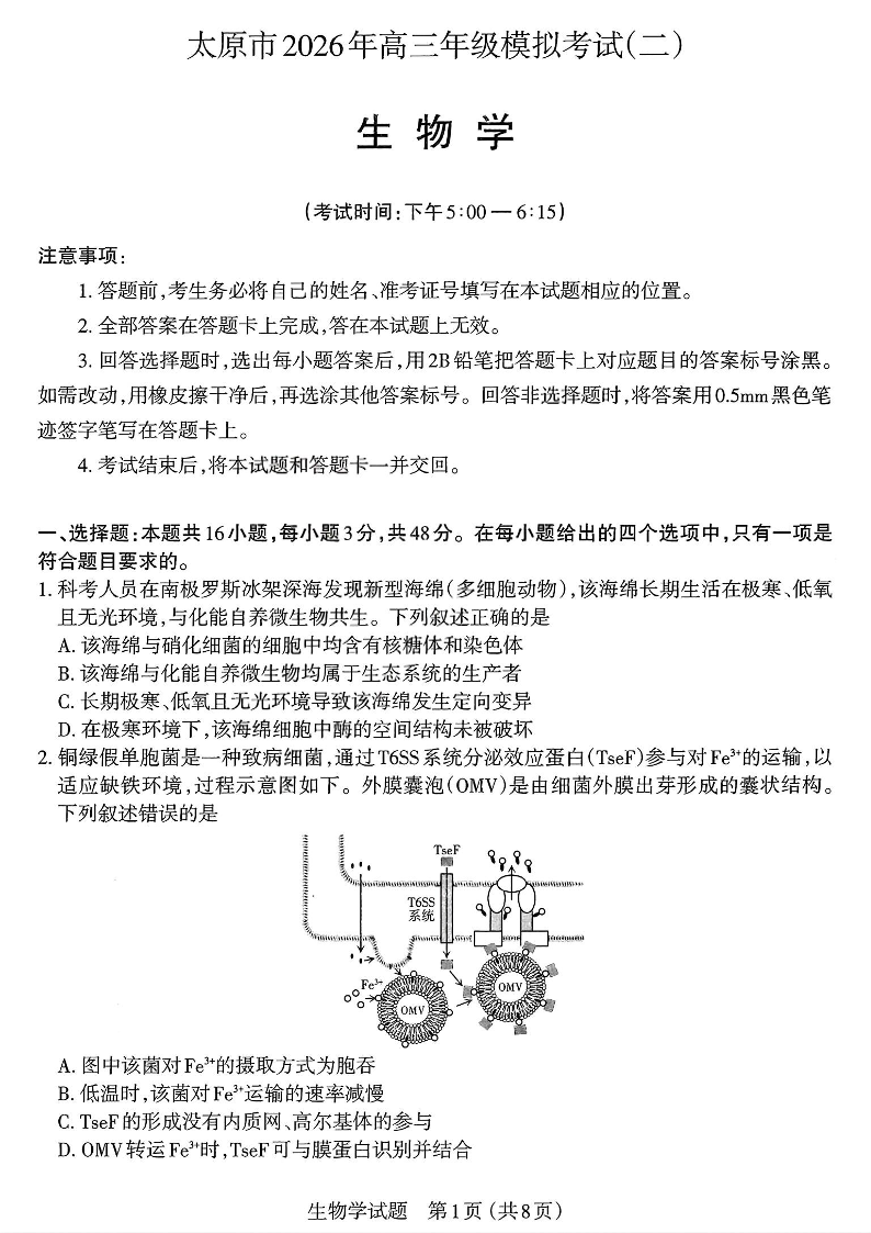 高三生物--山西省太原市2026届高三模拟考试(二)(太原二模)