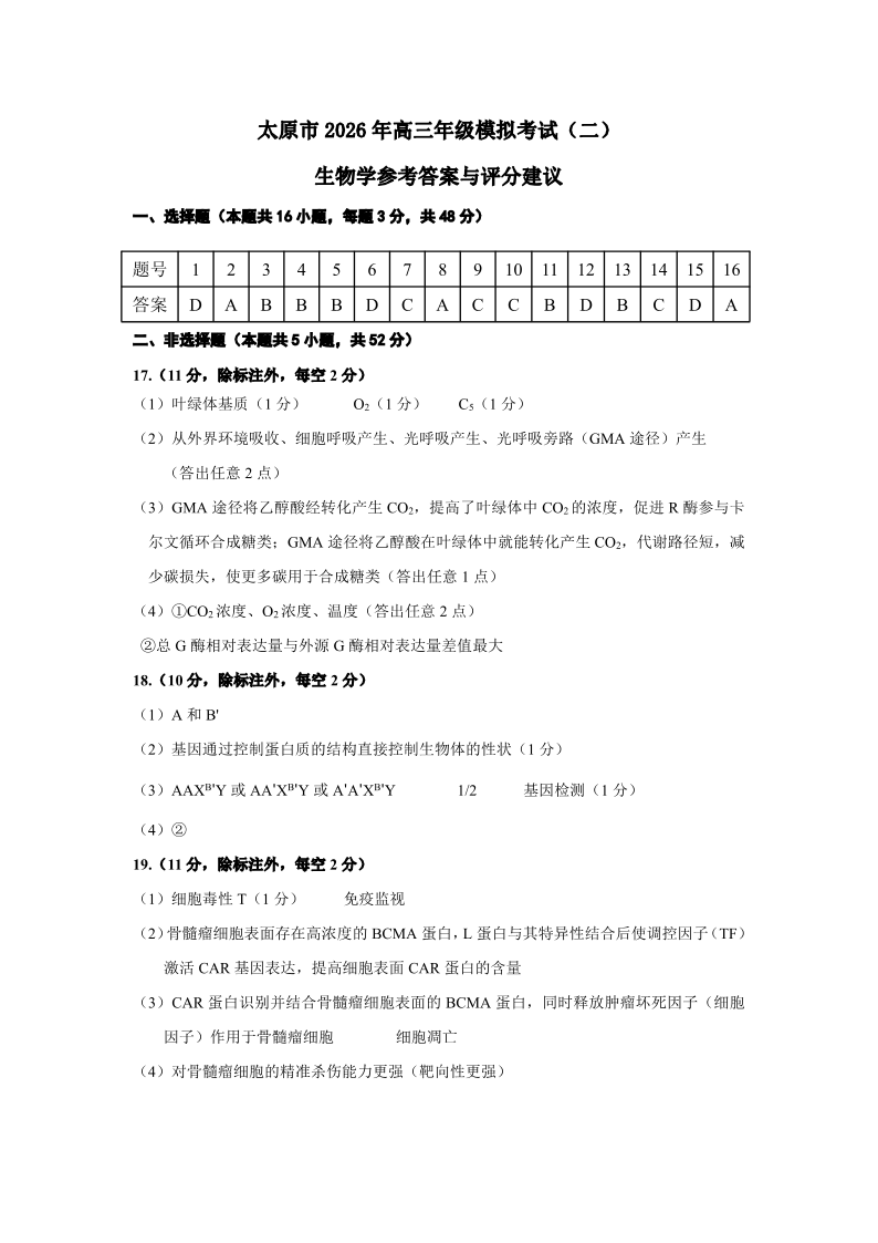 高三生物答案--山西省太原市2026届高三模拟考试(二)(太原二模)