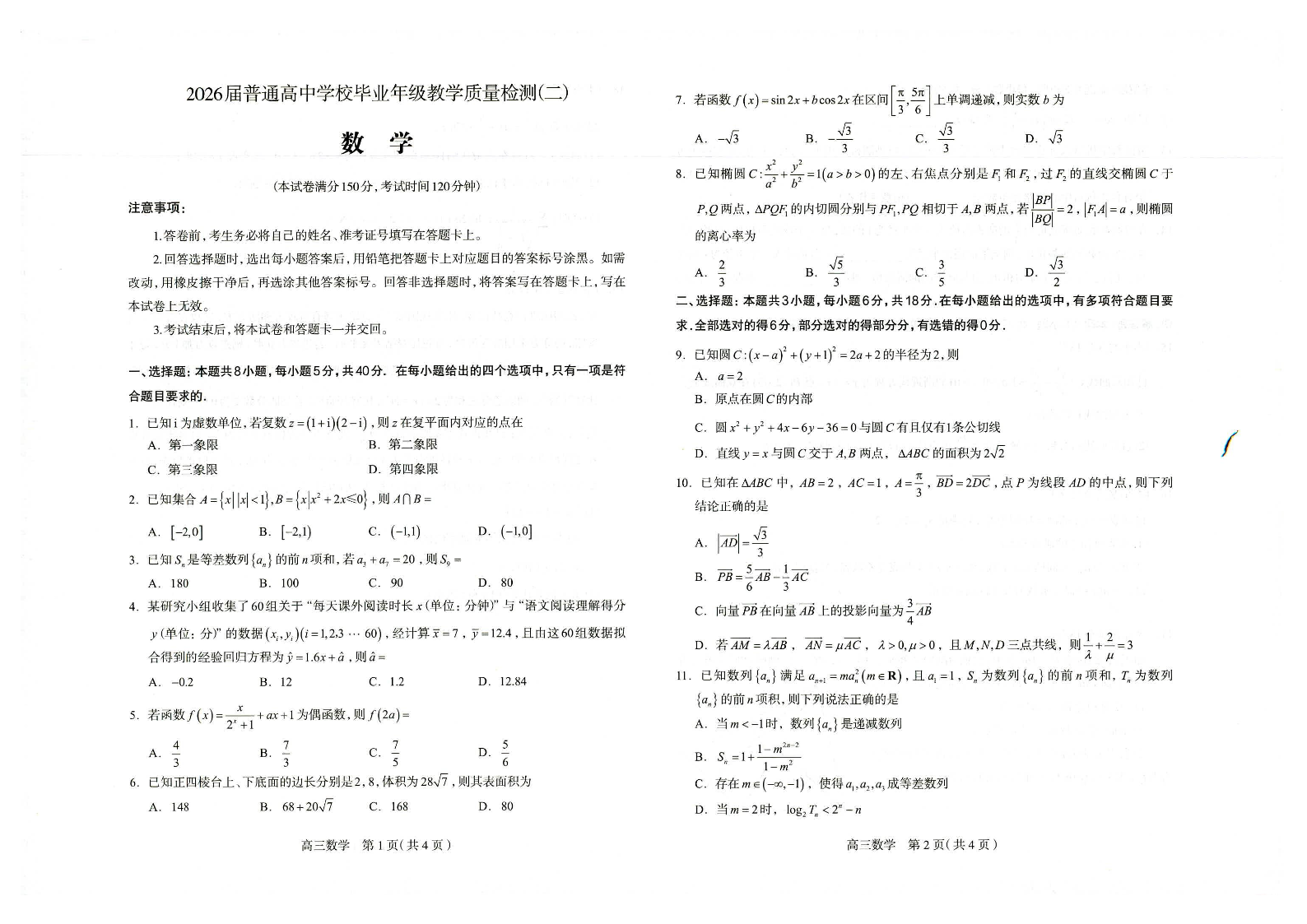 高三数学--河北省石家庄市2026届高三下学期教学质量检测(二)(石家庄二模)