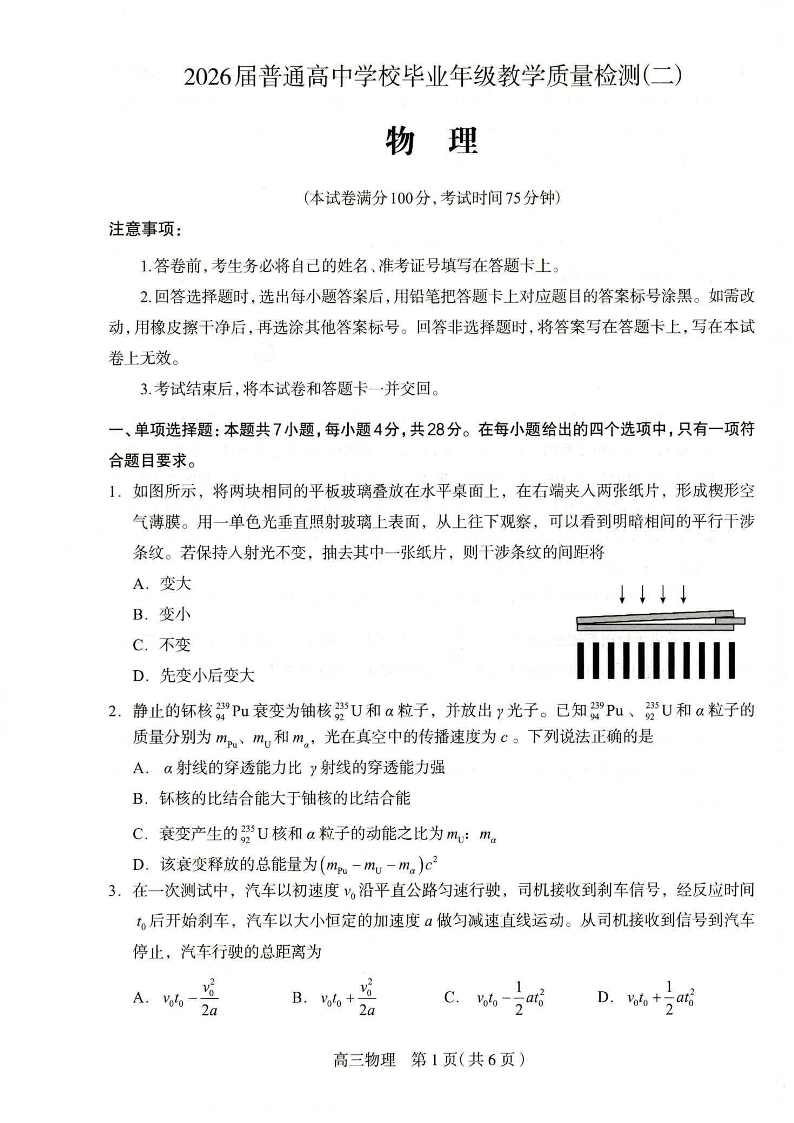 高三物理--河北省石家庄市2026届高三下学期教学质量检测(二)(石家庄二模)