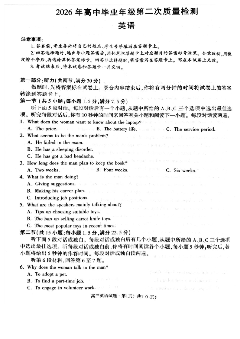 高三英语--河南省五市2026届高中毕业年级第二次质量检测(河南五市二模)