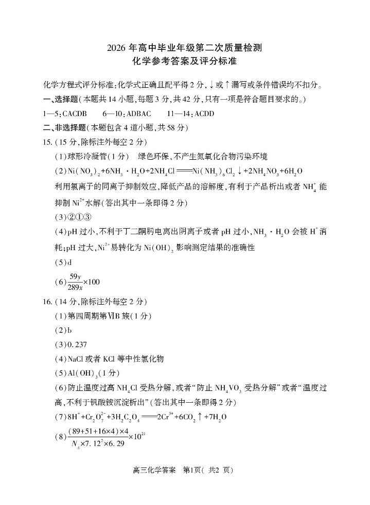 高三化学答案--河南省五市2026届高中毕业年级第二次质量检测(河南五市二模)
