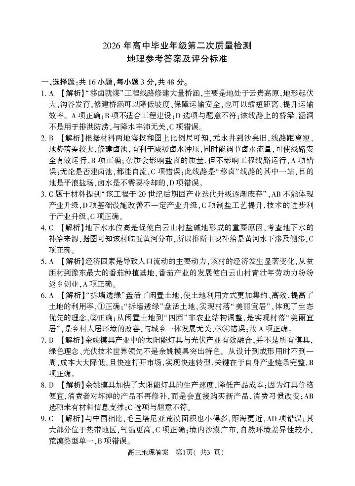 高三地理答案--河南省五市2026届高中毕业年级第二次质量检测(河南五市二模)