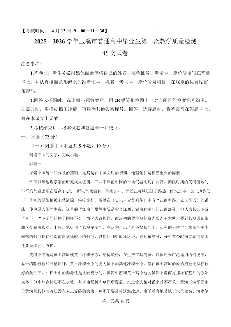 高三语文(原卷版)--云南省玉溪市2026届高三下学期第二次教学质量检测(玉溪二模)