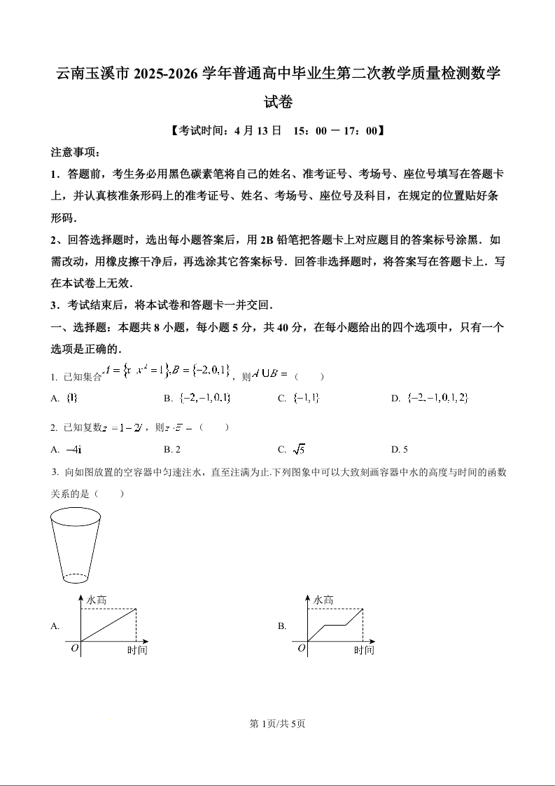 高三数学(原卷版)--云南省玉溪市2026届高三下学期第二次教学质量检测(玉溪二模)