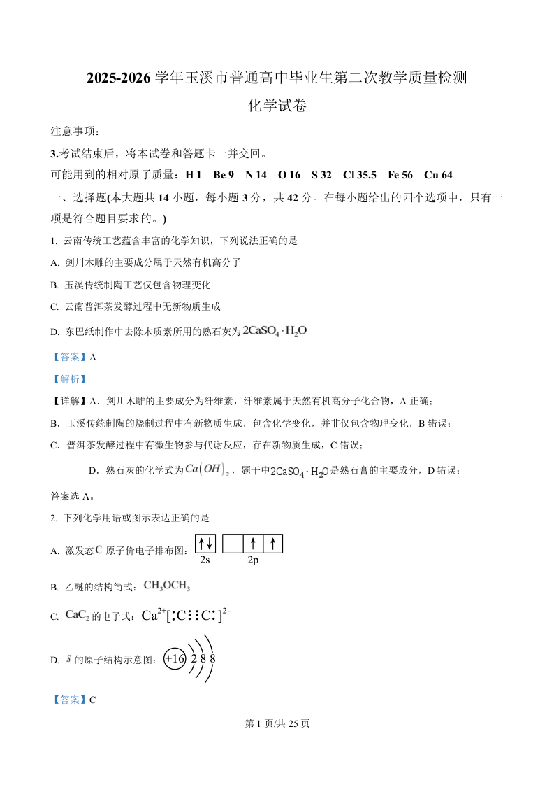 高三化学(解析版)--云南省玉溪市2026届高三下学期第二次教学质量检测(玉溪二模)