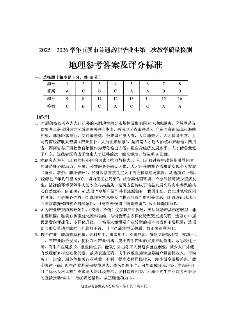 高三地理答案--云南省玉溪市2026届高三下学期第二次教学质量检测(玉溪二模)