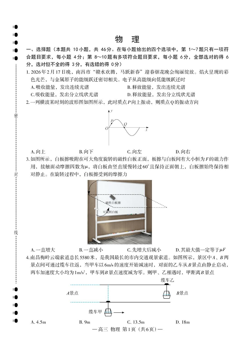 高三物理--江西省南昌市2026届高三下学期四月检测(南昌二模)