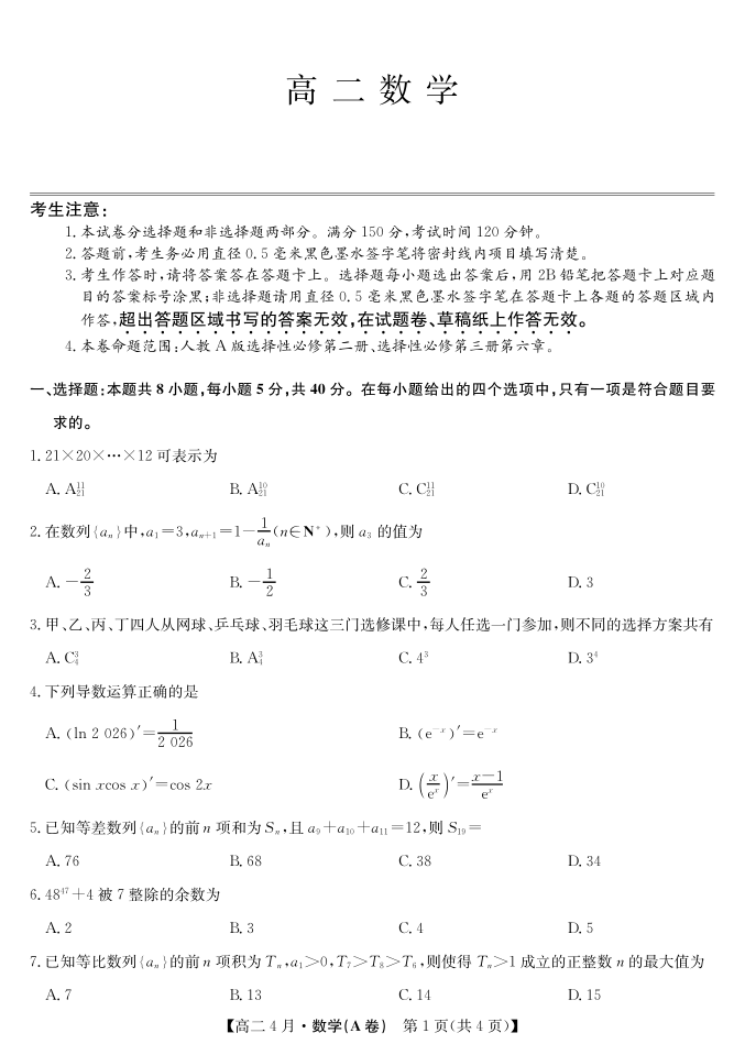 高二数学--安徽省县中联盟2025-2026学年高二年级下学期4月联考
