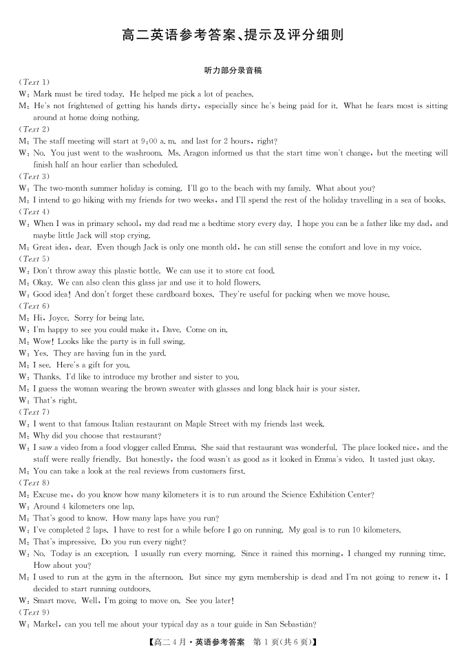 高二英语答案--安徽省县中联盟2025-2026学年高二年级下学期4月联考