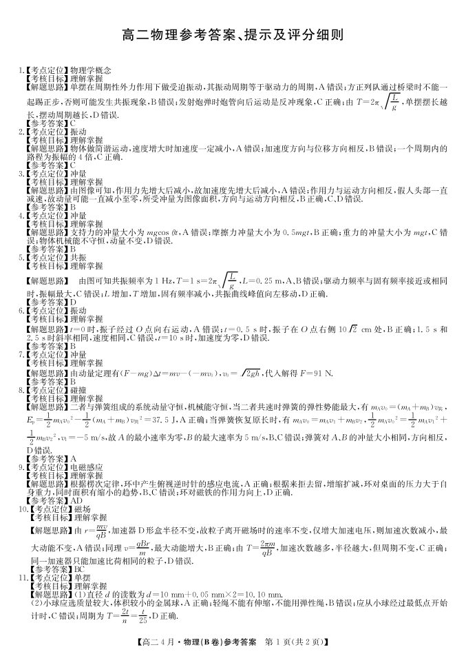 高二物理B答案--安徽省县中联盟2025-2026学年高二年级下学期4月联考