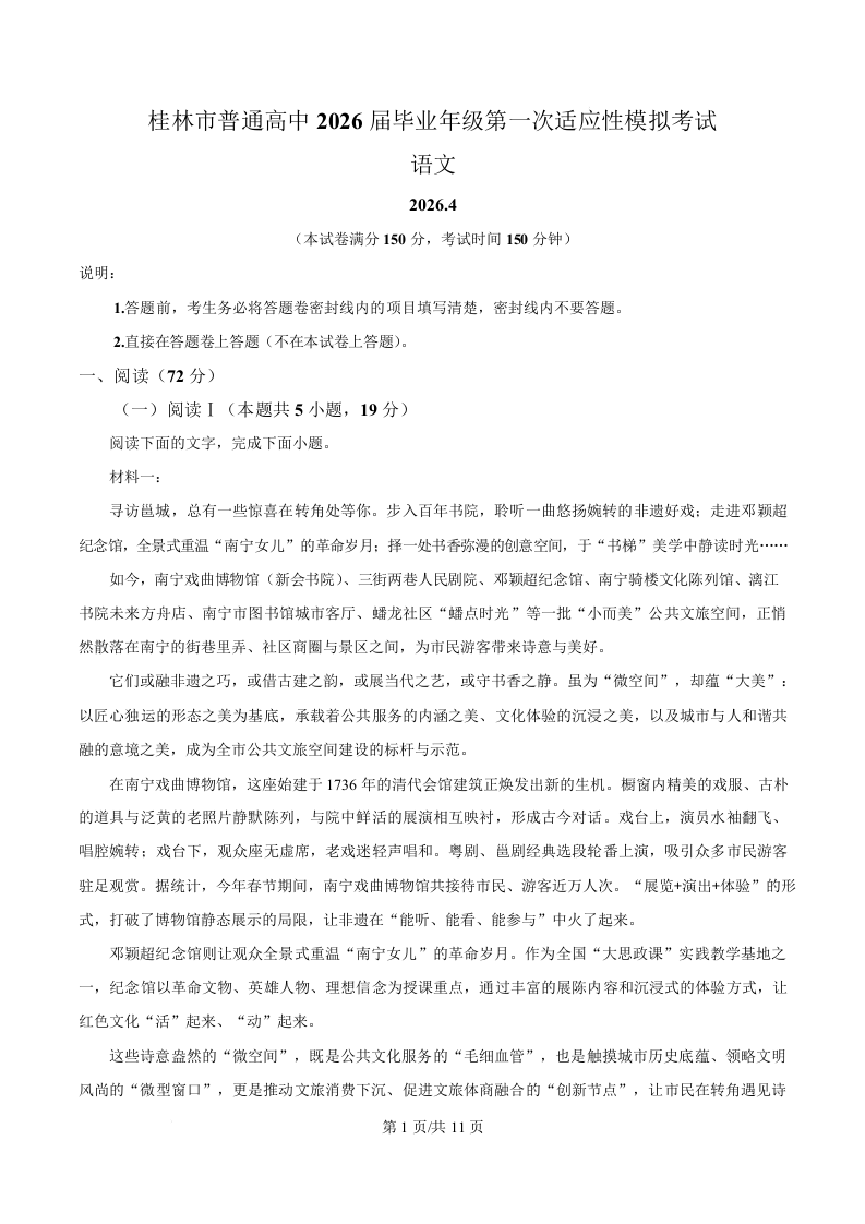高三语文(原卷版)--广西桂林市2026届高三下学期毕业年级第一次适应性模拟考试