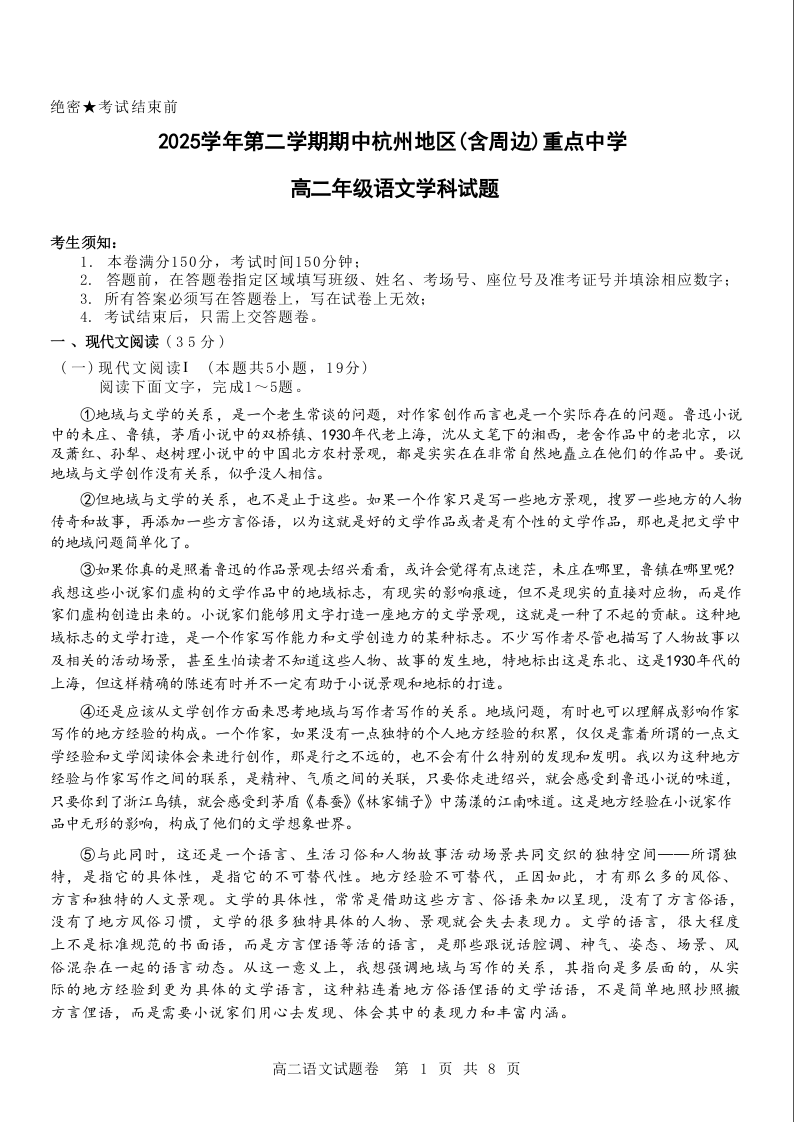 高二语文--浙江省杭州地区(含周边)重点中学2025-2026学年高二第二学期期中联考