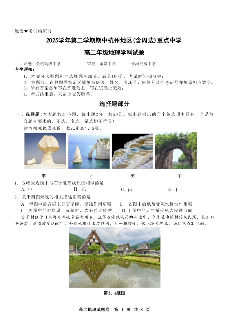 高二地理--浙江省杭州地区(含周边)重点中学2025-2026学年高二第二学期期中联考