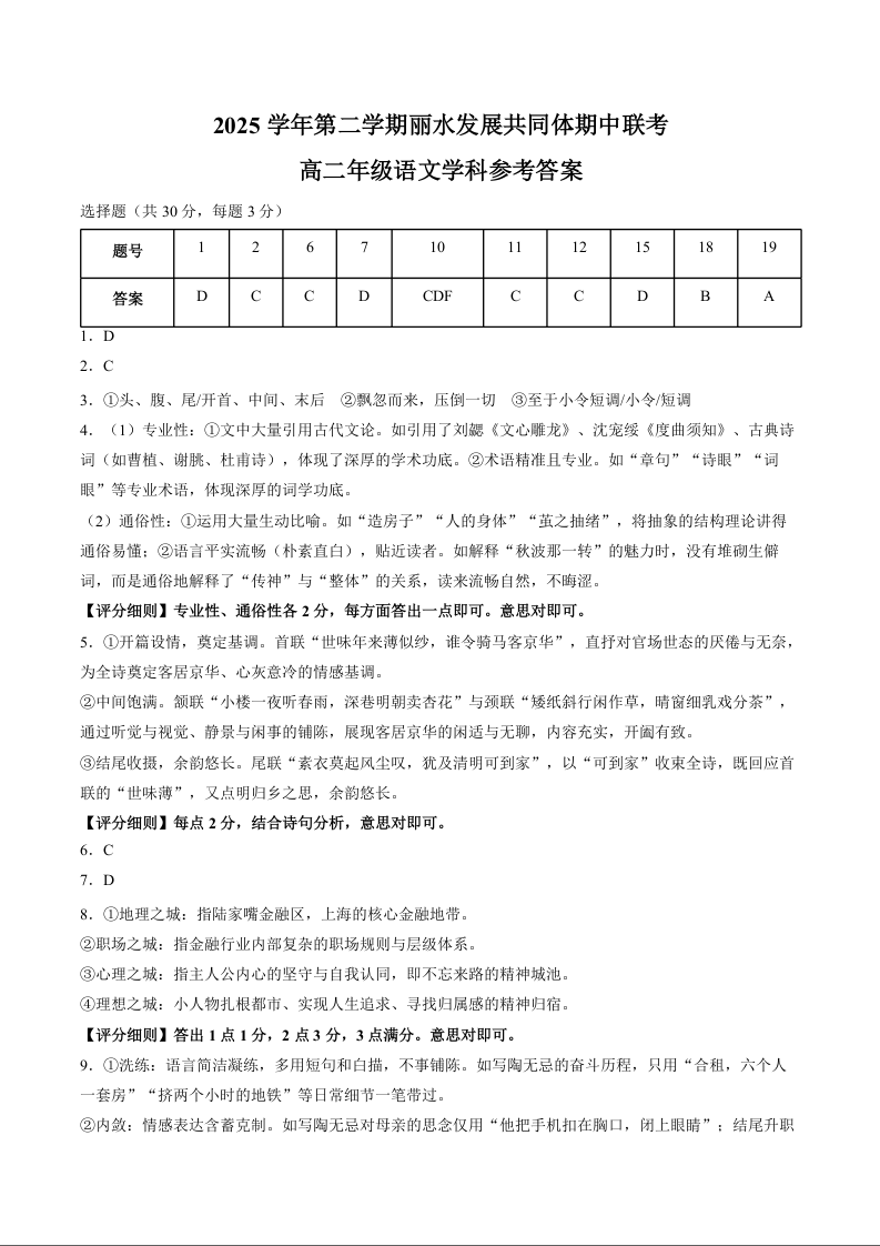 高二语文答案--浙江省丽水市发展共同体2025-2026学年高二下学期期中联考