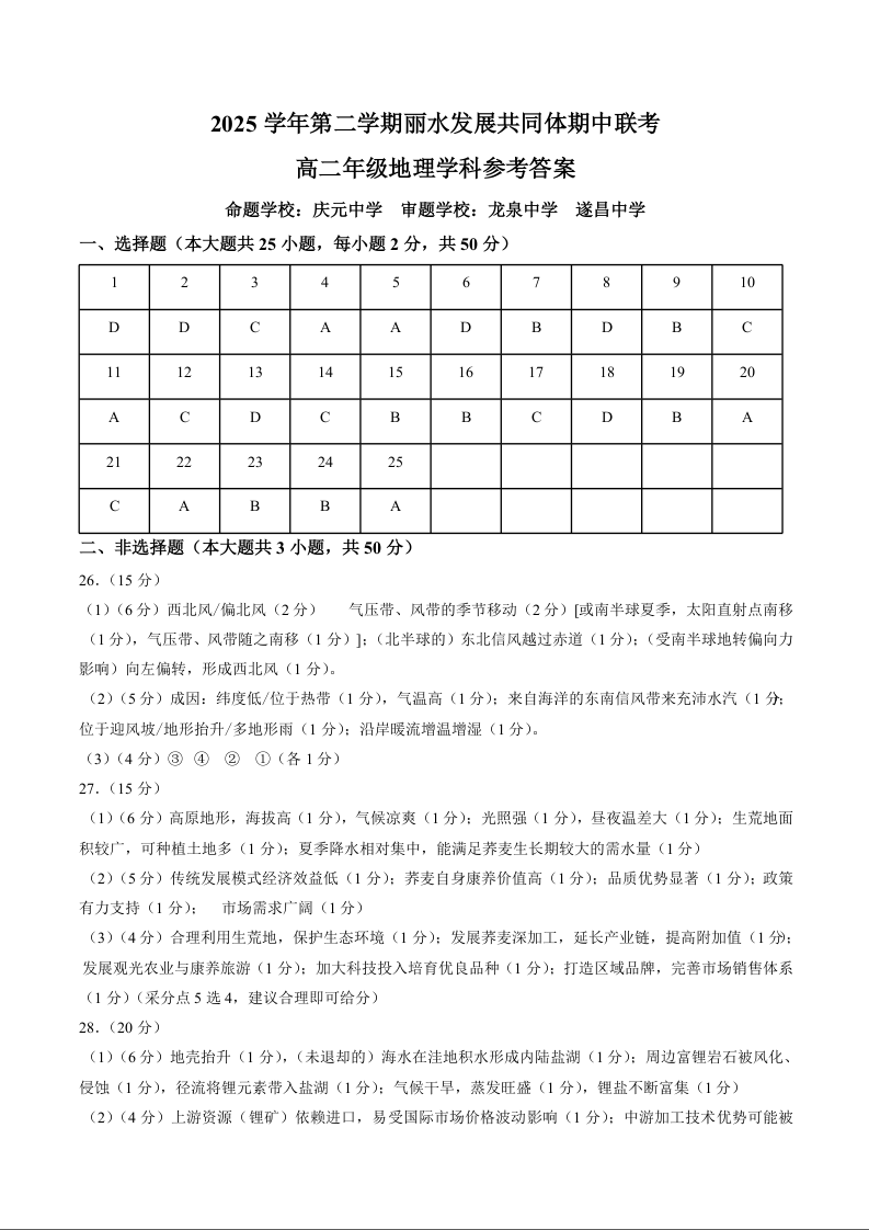 高二地理答案--浙江省丽水市发展共同体2025-2026学年高二下学期期中联考