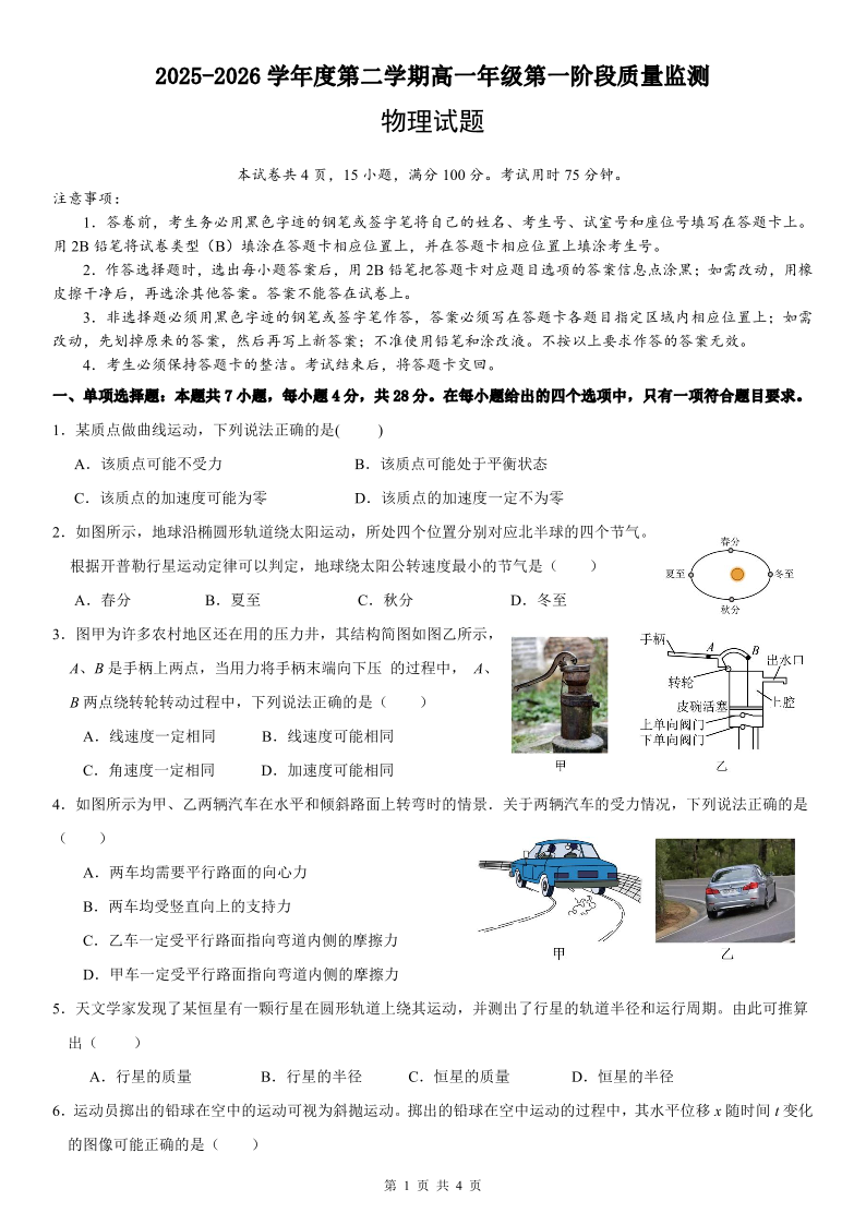 高一物理--广东省深圳市聚龙科学中学2025-2026学年高一下学期第一阶段质量监测联考
