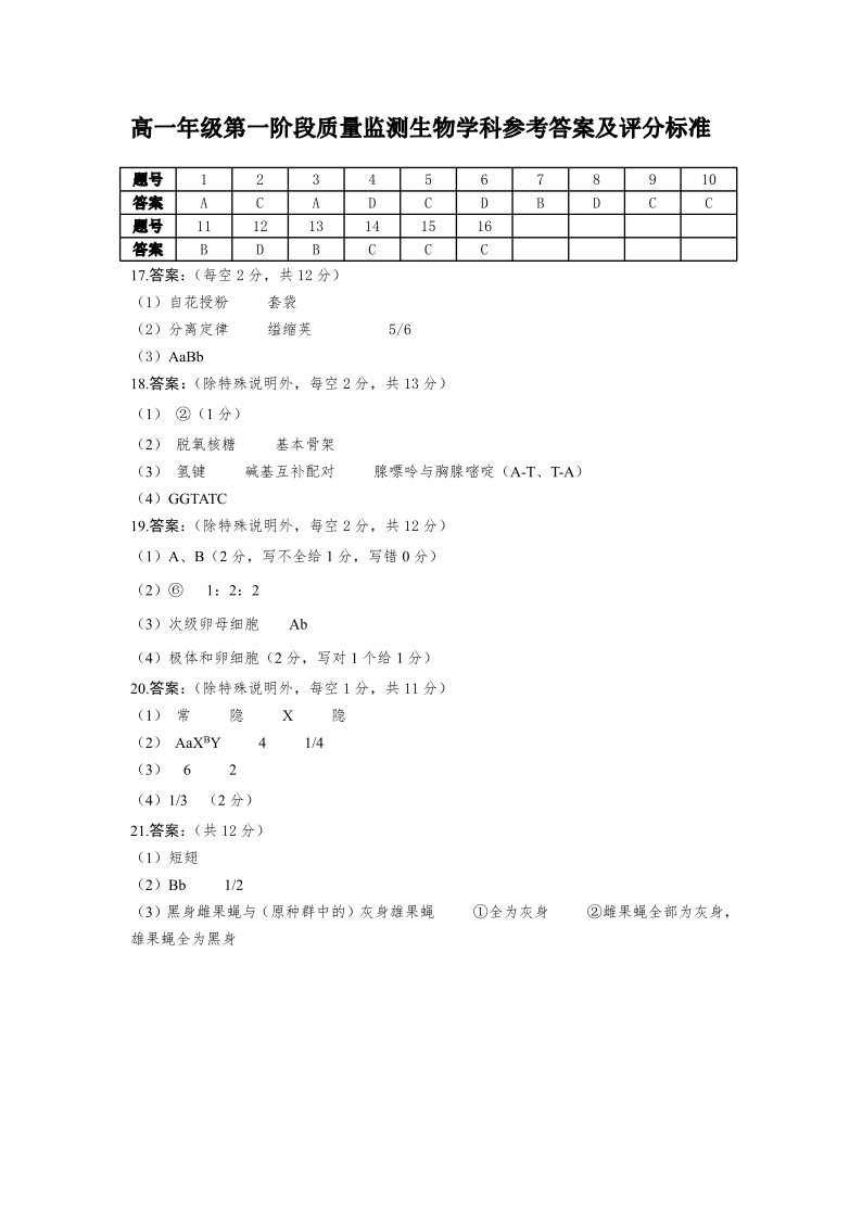 高一生物答案--广东省深圳市聚龙科学中学2025-2026学年高一下学期第一阶段质量监测联考