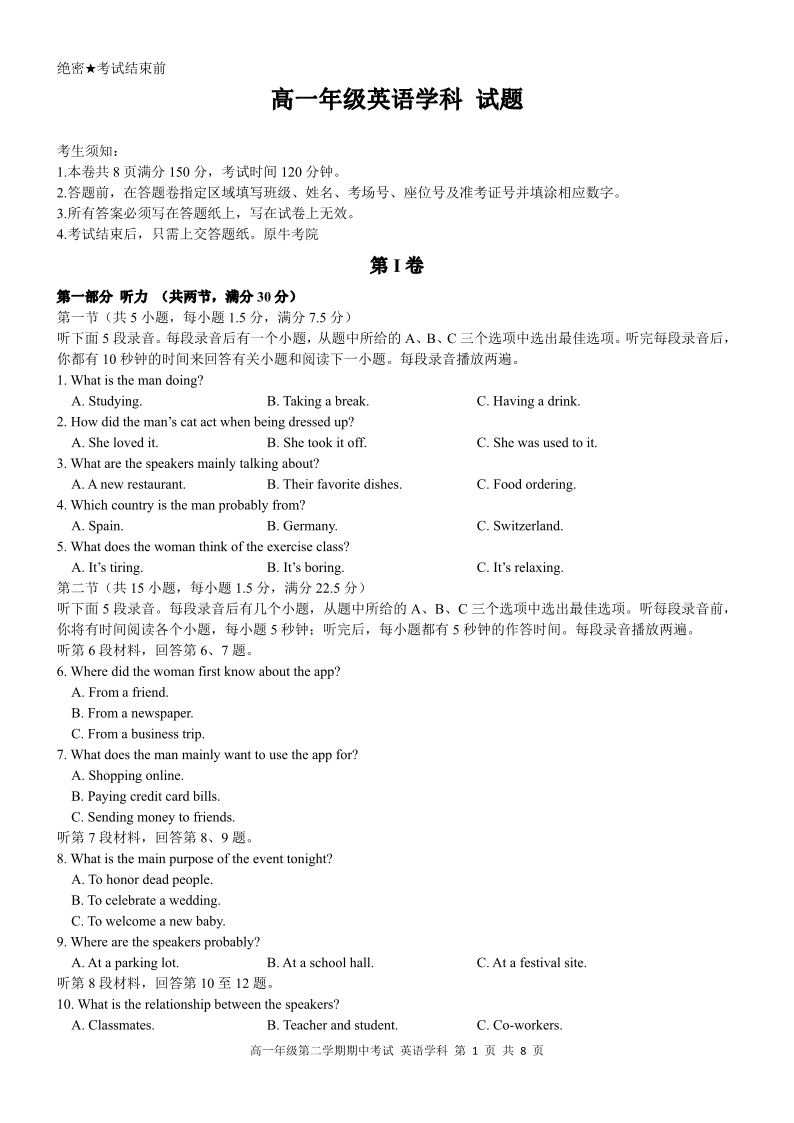 高一英语--浙江省衢州五校联考2025-2026学年高一下学期期中考考试