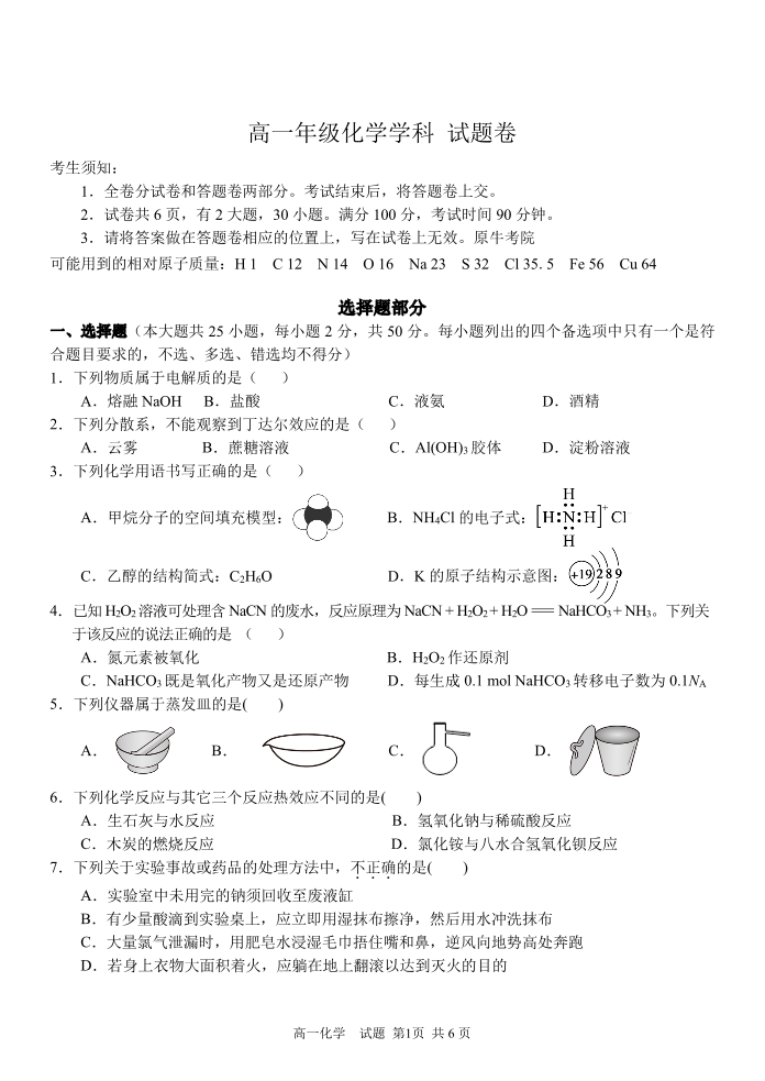 高一化学--浙江省衢州五校联考2025-2026学年高一下学期期中考考试
