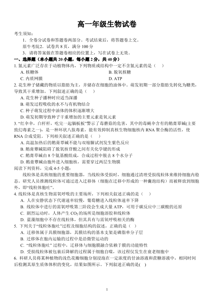 高一生物--浙江省衢州五校联考2025-2026学年高一下学期期中考考试