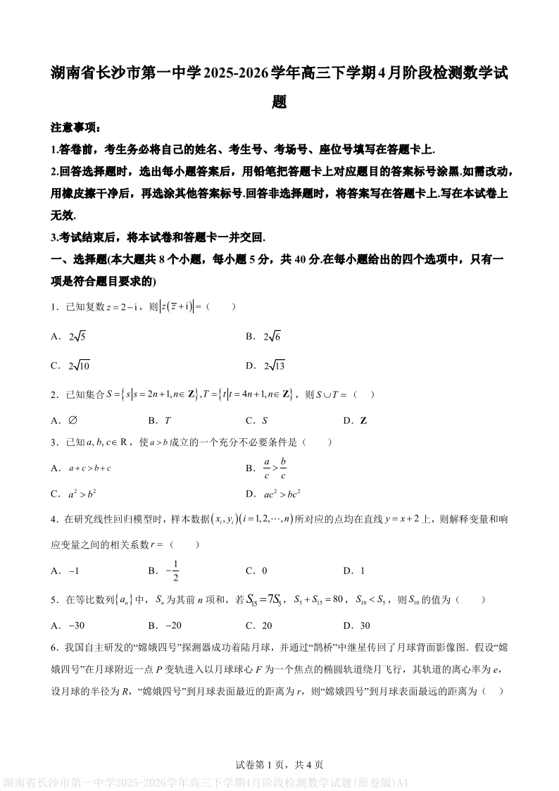 高三数学(原卷版)--湖南省长沙市第一中学2026届高三下学期第九次月考