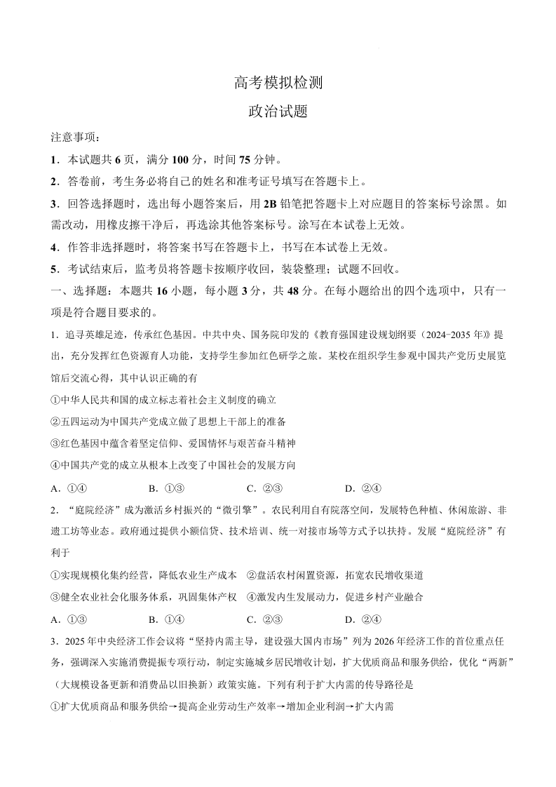 高三政治--陕西省咸阳市2026届高三下学期模拟检测(三)(咸阳三模)