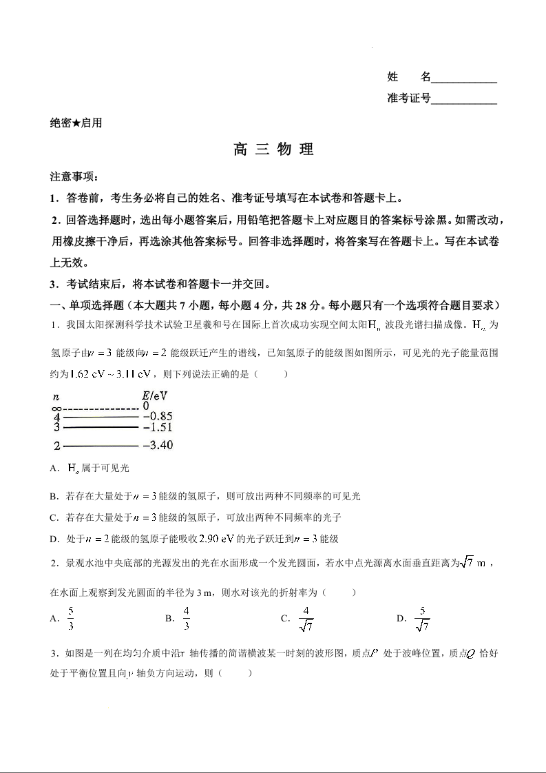 高三物理--湖南省衡阳市2026届高三下学期第二次联考(衡阳二模)
