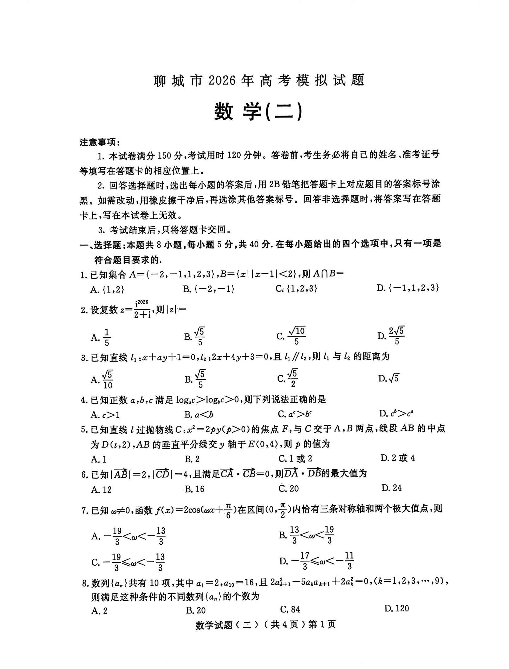 高三数学--聊城市2026年普通高中学业水平等级考试模拟卷