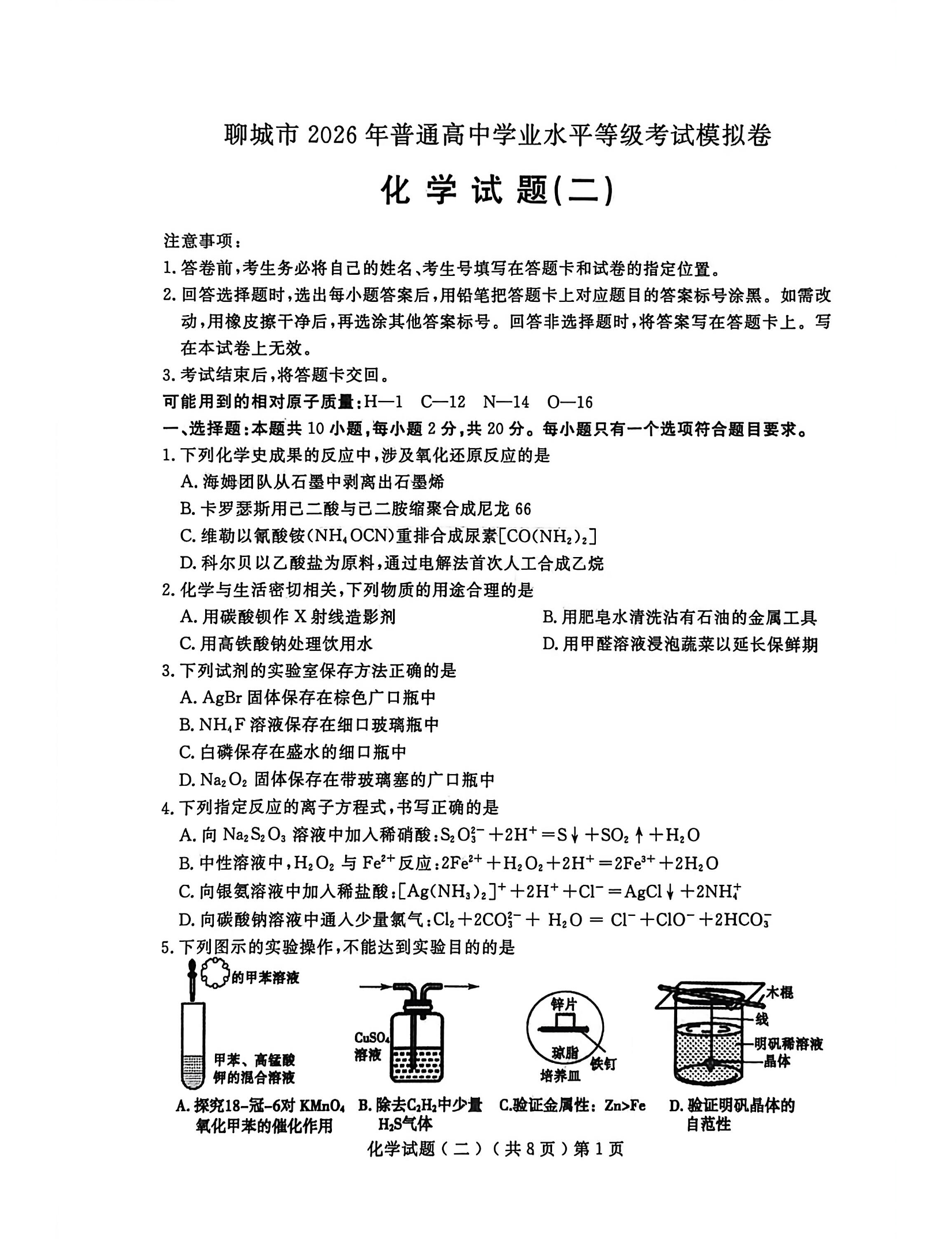 高三化学--聊城市2026年普通高中学业水平等级考试模拟卷