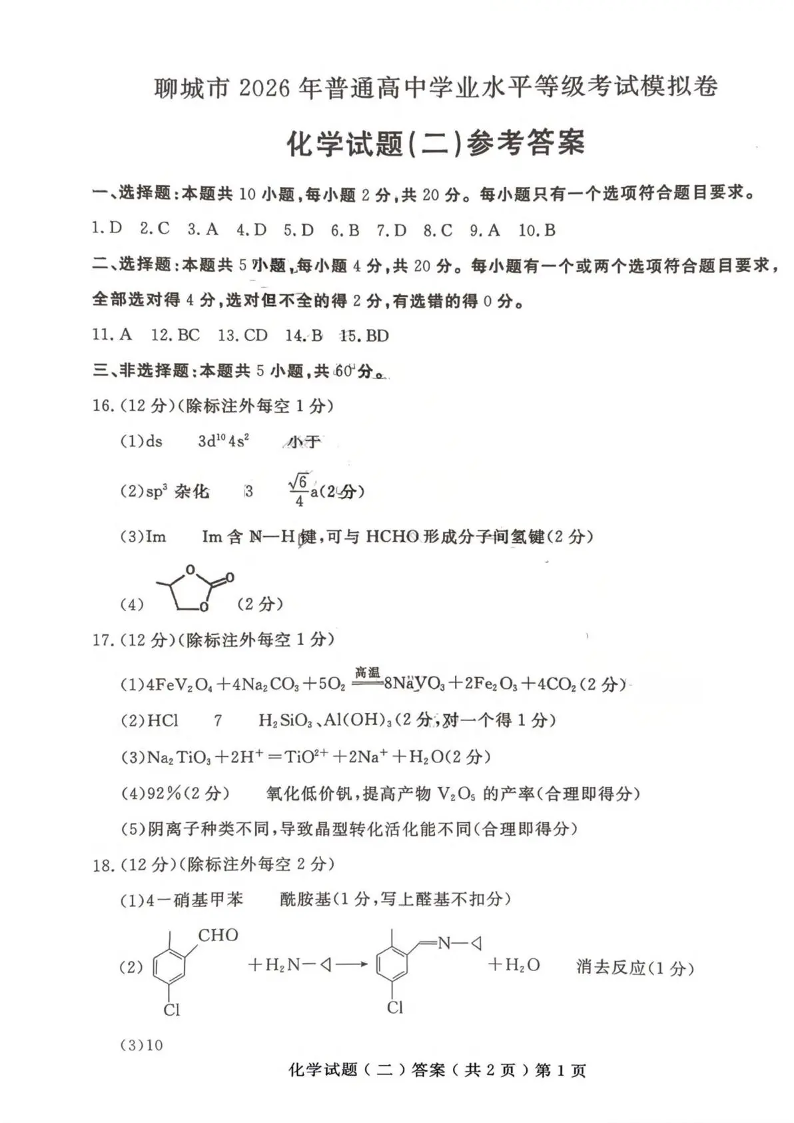 高三化学答案--聊城市2026年普通高中学业水平等级考试模拟卷